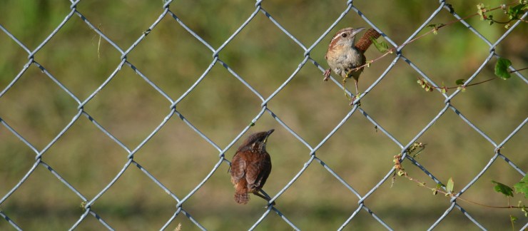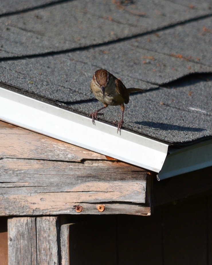 Dad was close by and landed on the fence next to the chick frantically calling it to follow him over to a nearby shed. He flew to the shed and back to the chick several times until the chick finally flew and landed at the edge of the tall grasses and disappeared. Dad kept calling and I could hear it moving further and further into the woods. I can only assume the chick was following and learning how to be a Carolina Wren.